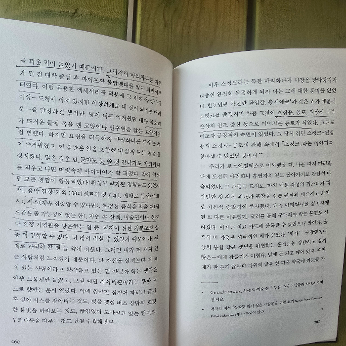 솔직히 약물 복용 경험에 대한 이야기는 너무나 적나라하게 묘사되어 있어 이 이야기가 작가 자신의 경험인가? 하는 생각에 몇 번이나 그 페이지들을 읽었다.
