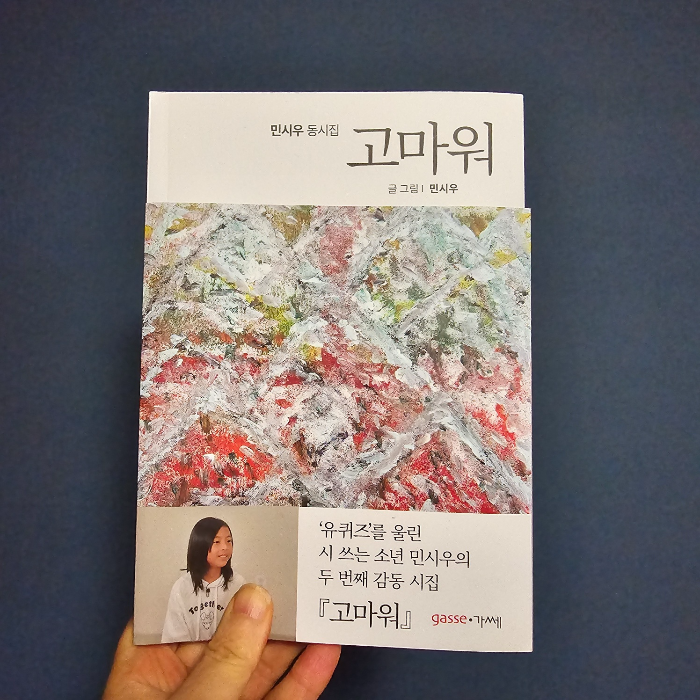 민시우 동시집 '고마워' 비가 온다. 한 방울, 두 방울, 뺨을 스치듯 흔적 없이 내리던 비가 고속도로 위로 차를 올렸을 무렵에는 억수같이 쏟아진다. 먼 길을 달려 낯선 곳에서 몇 마디의 인터뷰를 진행하고 다시 나의 공간으로 돌아오는 날 학원 아이들의 시끌벅적한 재잘거림이 빗소리에 묻혀 아득해지는 시간 창가 의자에 앉아 초등학교 5학년 어린이가 쓴 동시집을 펼쳤다. 제주 소년 민시우의 두 번째 동시집 '고마워' 초등학생 남자 아이의 감성이 이렇게 아름다울 수가 없다. 폐암으로 엄마를 먼저 하늘나라로 보낸 소년이 엄마에 대한 그리움을 한 권의 동시집에 담았다. 꼬마 시인은 현재 제주도에서 영화감독인 아빠와 함께 지내고 있다. 이 시집은 천국에 있는 엄마에게 보내는 시우의 그리움이 담겨있다. 엄마가 꼭 다시..